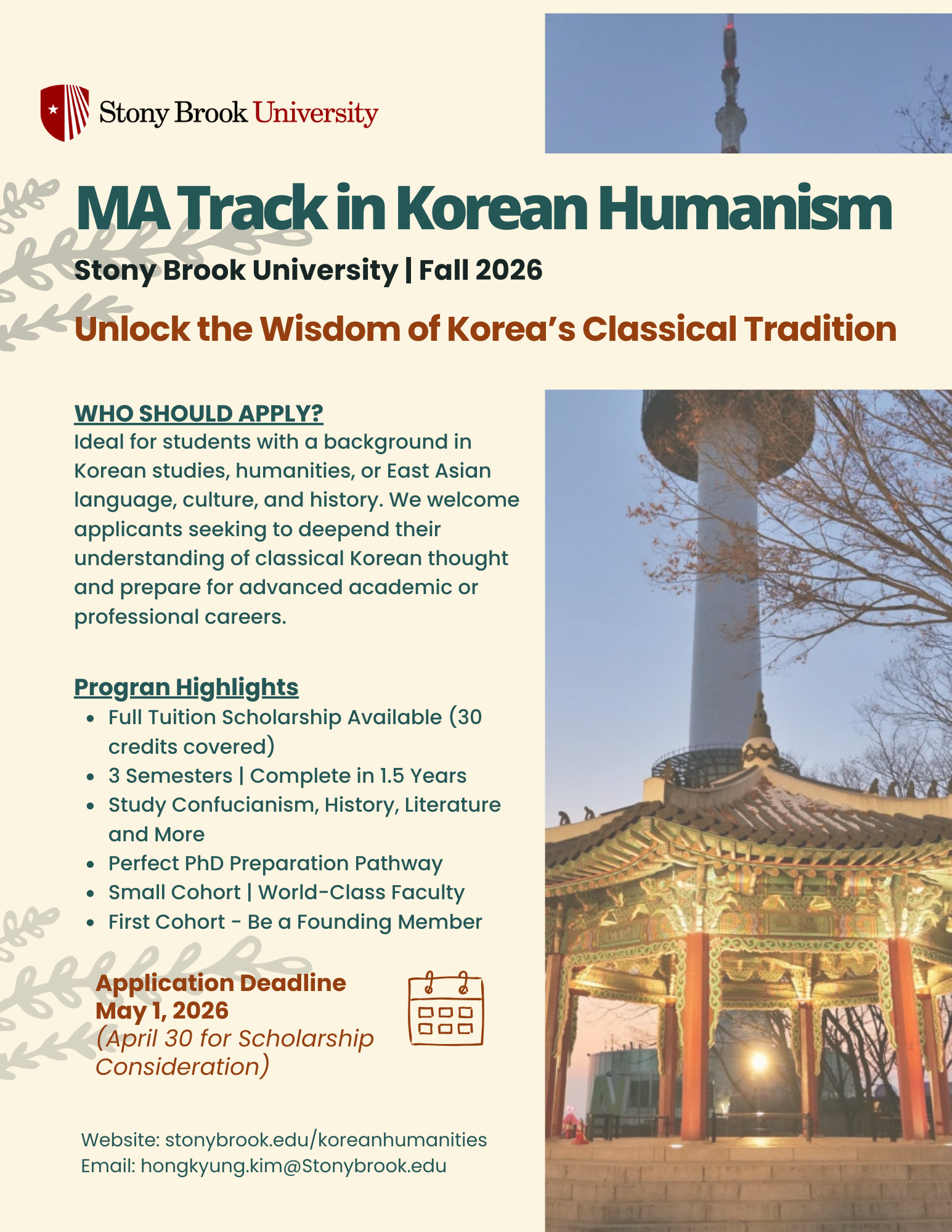 Stony Brook 대학에서 한국 고전 전통을 심층적으로 연구하는 한국인문학(Korean Humanism) 석사과정 장학생을 모집합니다. (본 과정은 26학년도 가을학기부터 운영됩니다.)
